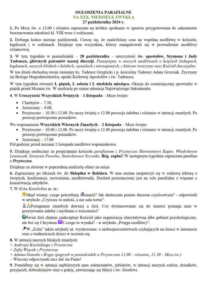 ROCZNICA POŚWIĘCENIA KOŚCIOŁA WŁASNEGO 27 października, 2024 by trojcajeziorzany@gmail.com Leave a Comment