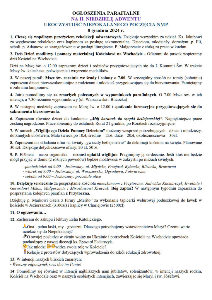 II. NIEDZIELA ADWENTU – UROCZYSTOŚĆ NIEPOKALANEGO POCZĘCIA – ogłoszenia i intencje mszalne 9-15 XII 8 grudnia, 2024 by trojcajeziorzany@gmail.com Leave a Comment